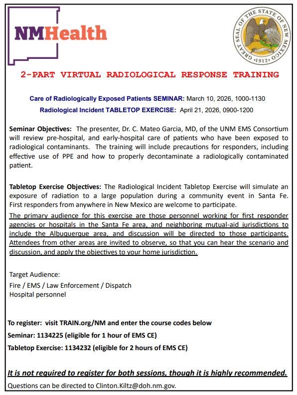 For more information, please check-in to the Sandoval County ARES radio Net, held on the SCARES repeater system every Monday evening at 1930 local time (except the THIRD Monday of each month at 1900, which is our regular meeting night).